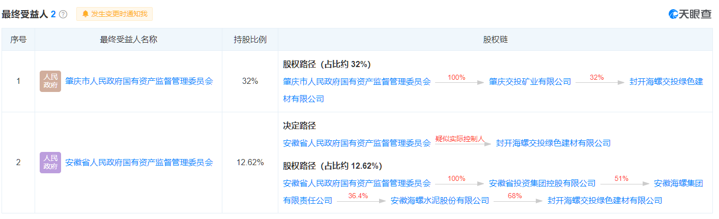 從最終受益人結構圖可見,肇慶交投礦業有限公司最終受益人為肇慶市國資委,而海螺水泥為安徽省國資委下屬企業。