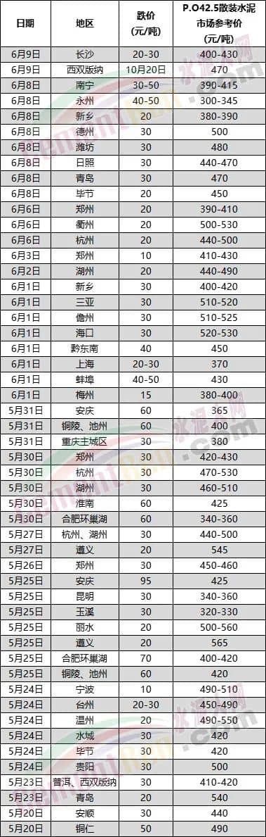 目前,南方地區相繼進入雨季,水泥市場處于傳統淡季,疊加外來低價水泥沖擊和周邊市場跌價帶動,長三角區域水泥價格大幅調整,影響面較大。加之原材價格下跌,成本下降,競爭壓力加劇,水泥價格處于持續下跌中。江蘇沿江區域主要品牌企業P.O42.5水泥出廠價格已低至270-280元/噸。