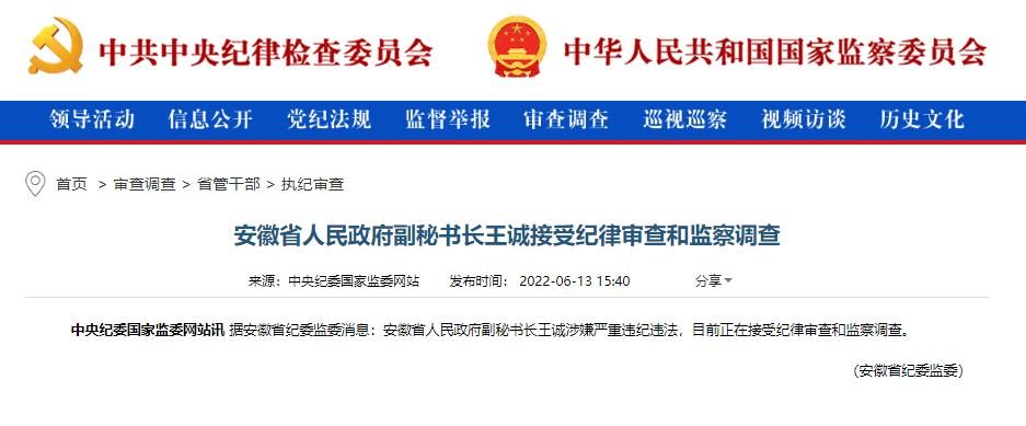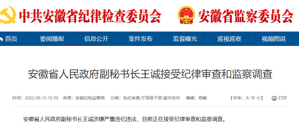 據(jù)安徽省紀(jì)委監(jiān)委消息:安徽省人民政府副秘書長(zhǎng)王誠(chéng)涉嫌嚴(yán)重違紀(jì)違法,目前正在接受紀(jì)律審查和監(jiān)察調(diào)查。