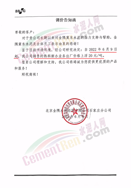 日前,北京金隅水泥經貿有限公司石家莊分公司通知,鑒于目前市場環境,公司銷售的熟料新辦業務出廠價格上浮20元/噸。