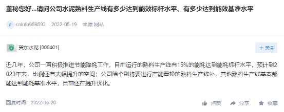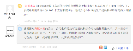 冀東水泥回復投資者時稱,近幾年,公司一直積極推進節能降耗工作,目前運行的熟料生產線有15%的能耗達到能耗標桿水平,預計到2023年末,比例還有大幅提升的空間;公司除個別將要進行產能置換的熟料生產線外,其他熟料生產線基本都能達到能耗基準水平,目前還在提升優化。