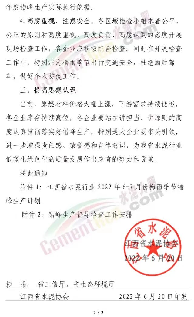 江西省通知要求全省所有熟料窯線錯(cuò)峰生產(chǎn)15天,原則上安排在6月20日-7月5日完成,對(duì)單個(gè)工廠具有2條(含)以上窯線的,如確實(shí)所有窯線不能統(tǒng)一錯(cuò)的,在保持本工廠錯(cuò)峰天數(shù)不變的情況下可通過其中的1條或2條窯線來調(diào)節(jié)置換,計(jì)劃外停窯的不納入本次錯(cuò)峰生產(chǎn)時(shí)間。