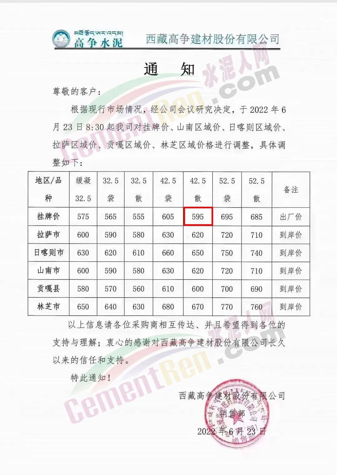 水泥人網(wǎng)通訊員消息,6月23日西藏高爭建材股份有限公司通知,根據(jù)現(xiàn)行市場情況,經(jīng)公司研究決定于6月23日8時30分起對公司掛牌價、山南區(qū)域價、日喀則區(qū)域價、拉薩區(qū)域價、貢嘎區(qū)域價、林芝區(qū)域價進行調(diào)整。調(diào)整后P.O42.5散裝水泥掛牌出廠價595元/噸,林芝市到岸價670元/噸。