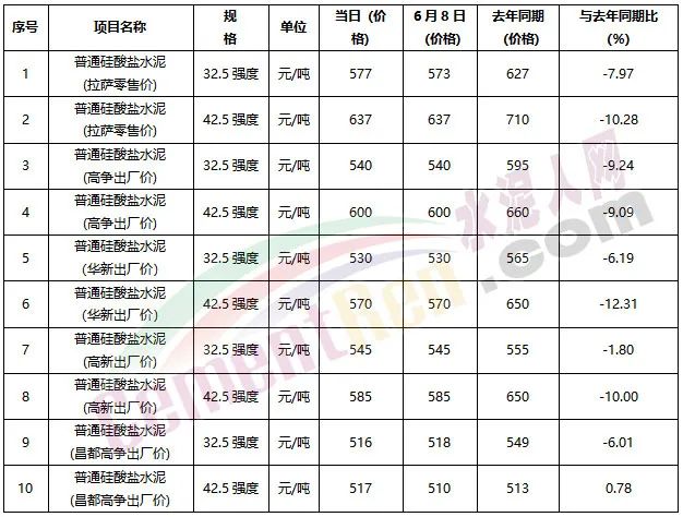 西藏發(fā)改委于6月15日公布的拉薩市主要建材價格監(jiān)測表(第24周)顯示,6月15日價格最高為637元/噸,與上年同期相比下跌了10.28%。