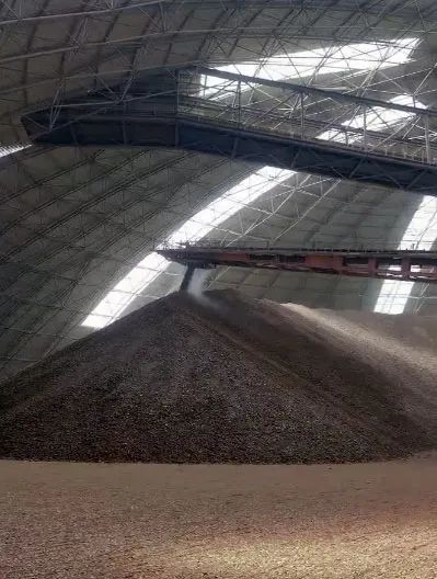 原料由圓形預均化堆場外部羅鍋皮帶輸送至堆場內,將原料卸于堆場中心處圓形中空輸料圓筒內,原料下落至架空的膠帶輸送機膠帶上,架空的膠帶輸送機雙向旋轉擺動,原料從架空的膠帶輸送機的機尾處落下,機尾處落料點一般距地面較高,在擺動布料時,機尾落料處會隨著料堆的起伏而上下擺動,機尾落料處的物料落差平均達3-5米高。