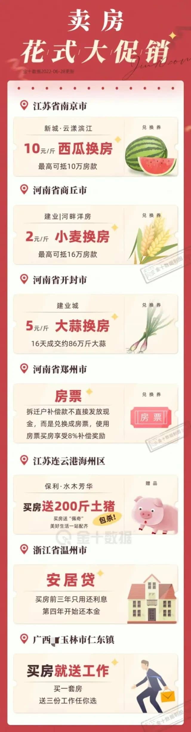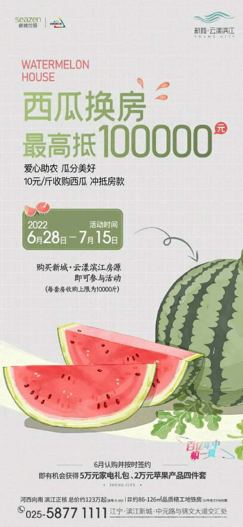 6 月 28 日,新城控股位于南京江寧的云漾濱江項目海報上赫然寫著 “ 西瓜換房最高抵 100000 元”,西瓜 10 元/斤,每套房收購上限為 1 萬斤。