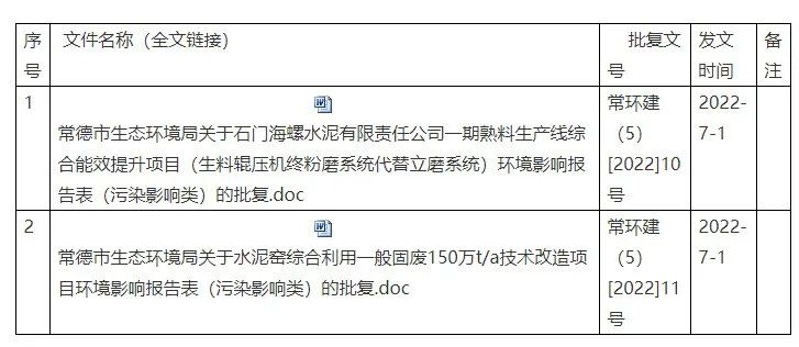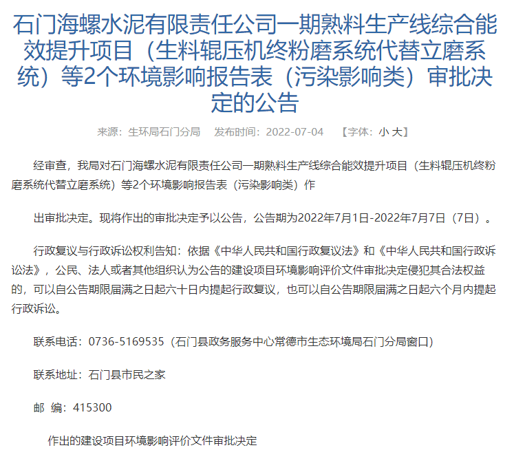 7月4日,湖南省常德市石門(mén)縣政府轉(zhuǎn)發(fā)環(huán)局石門(mén)分局的《石門(mén)海螺水泥有限責(zé)任公司一期熟料生產(chǎn)線綜合能效提升項(xiàng)目(生料輥壓機(jī)終粉磨系統(tǒng)代替立磨系統(tǒng))等2個(gè)環(huán)境影響報(bào)告表(污染影響類)審批決定的公告》稱,經(jīng)審查,生環(huán)局石門(mén)分局對(duì)石門(mén)海螺水泥有限責(zé)任公司一期熟料生產(chǎn)線綜合能效提升項(xiàng)目(生料輥壓機(jī)終粉磨系統(tǒng)代替立磨系統(tǒng))等2個(gè)環(huán)境影響報(bào)告表(污染影響類)作出審批決定。并將作出的審批決定予以公告。公告期為2022年7月1日-2022年7月7日。