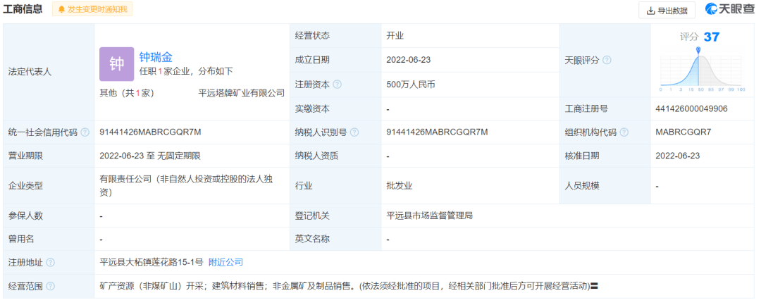 天眼查APP顯示,平遠塔牌礦業有限公司,于2022年6月23日成立,注冊資本為500萬人民幣,法定代表人為鐘瑞金,經營狀態為開業,工商注冊號為441426000049906,注冊地址為平遠縣大柘鎮蓮花路15-1號,經營范圍包括礦產資源(非煤礦山)開采;建筑材料銷售;非金屬礦及制品銷售。