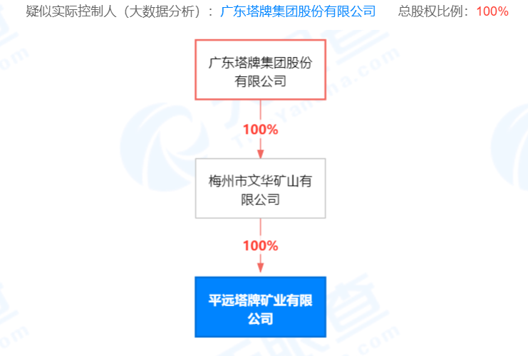 企業疑似實際控制人為廣東塔牌集團股份有限公司,總股權比例達100%。