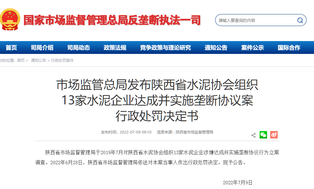 日前,市場監管總局發布陜西省水泥協會組織13家水泥企業達成并實施壟斷協議案行政處罰決定書稱,陜西省市場監督管理局于2019年7月對陜西省水泥協會組織13家水泥企業涉嫌達成并實施壟斷協議行為立案調查。2022年6月28日,陜西省市場監督管理局依法對本案當事人作出行政處罰決定?,F予公告。