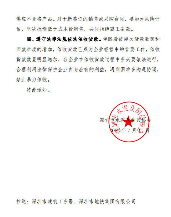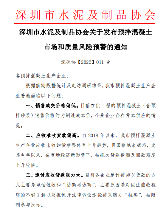 日前,深圳市水泥及制品協(xié)會關于發(fā)布預拌混凝土市場和質量風險預警的通知給各預拌混凝土生產企業(yè)稱,根據(jù)前期數(shù)據(jù)統(tǒng)計及走訪調研結果,深圳市預拌混凝土生產企業(yè)普遍面臨銷售成交價格偏低、應收難收貨款偏高、追討應收貨款阻力大、新中標價格持續(xù)偏低等問題。