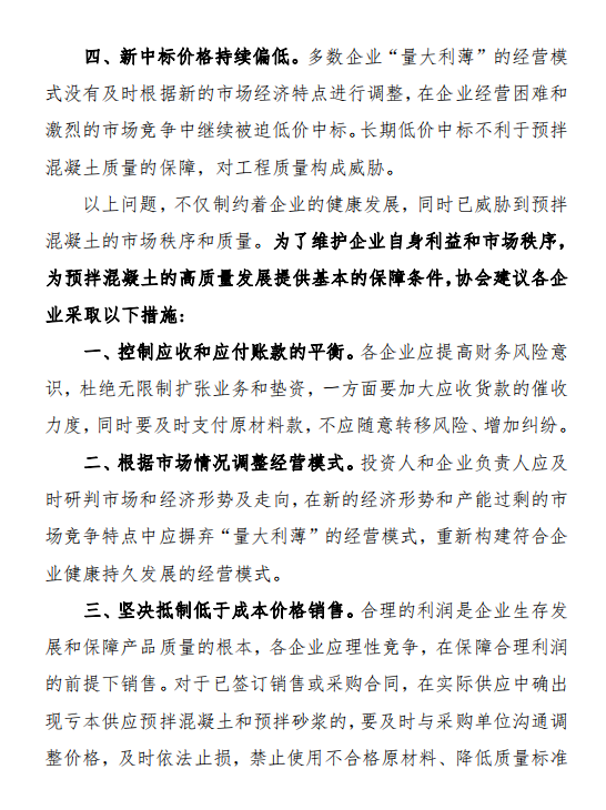 以上問題,不僅制約著企業(yè)的健康發(fā)展,同時已威脅到預拌混凝土的市場秩序和質量。為了維護企業(yè)自身利益和市場秩序,為預拌混凝土的高質量發(fā)展提供基本的保障條件,協(xié)會建議各企業(yè),控制應收和應付賬款的平衡、根據(jù)市場情況調整經(jīng)營模式、堅決抵制低于成本價格銷售、遵守法律法規(guī)依法催收貨款。