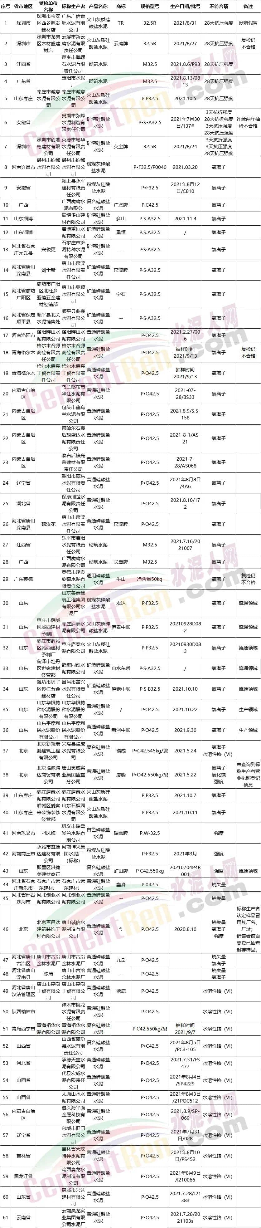 據不完全統計,今年上半年以來,各區域通報的水泥產品質量監督抽查結果顯示,共有61批次水泥產品不合格,不合格項目涉及氧化鎂、燒失量、氯離子、抗壓、抗折強度、水溶性鉻(VI)等,不合格品不僅涉及低標號水泥也包括部分高標號水泥,不僅有包裝水泥也有個別企業的散裝水泥被通報不合格。