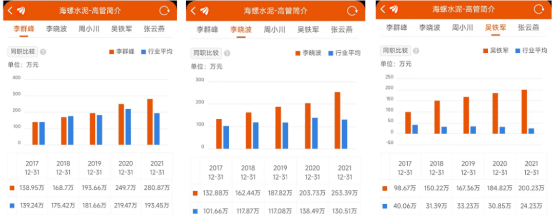 從海螺水泥上市公司公布的16位高管列表可見:海螺水泥總經理李群峰年薪280.9萬元。副總經理李曉波,總經理助理吳鐵軍、虞水,職工監事劉田田等5位上市公司高管年薪均在200萬以上。李群峰、李曉波、吳鐵軍三位高管年薪近五年薪資逐年上漲。