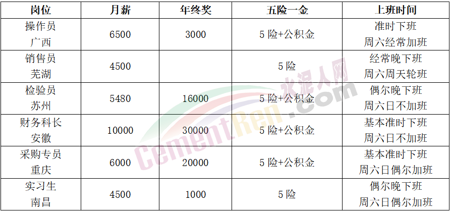華潤水泥員工分享說:“五險一金和社會保險,住房補貼,交通補助,伙食補貼都有,還有中夜班補貼。一個月可以休息8天,還有過節費,生日卡,年終獎金,結婚還有結婚禮金,公司有年假。”