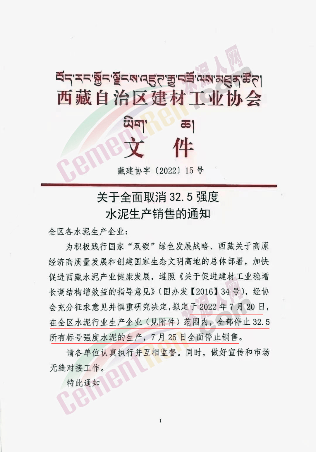 通知稱,為積極踐行國家“雙碳”綠色發(fā)展戰(zhàn)略、西藏關(guān)于高原經(jīng)濟(jì)高質(zhì)量發(fā)展和創(chuàng)建國家生態(tài)文明高地的總體部署,加快促進(jìn)西藏水泥產(chǎn)業(yè)健康發(fā)展,遵照相關(guān)文件要求,擬定于2022年7月20日,在全區(qū)水泥行業(yè)生產(chǎn)企業(yè)范圍內(nèi),全部停止32.5所有標(biāo)號(hào)強(qiáng)度水泥的生產(chǎn),7月25日全面停止銷售。