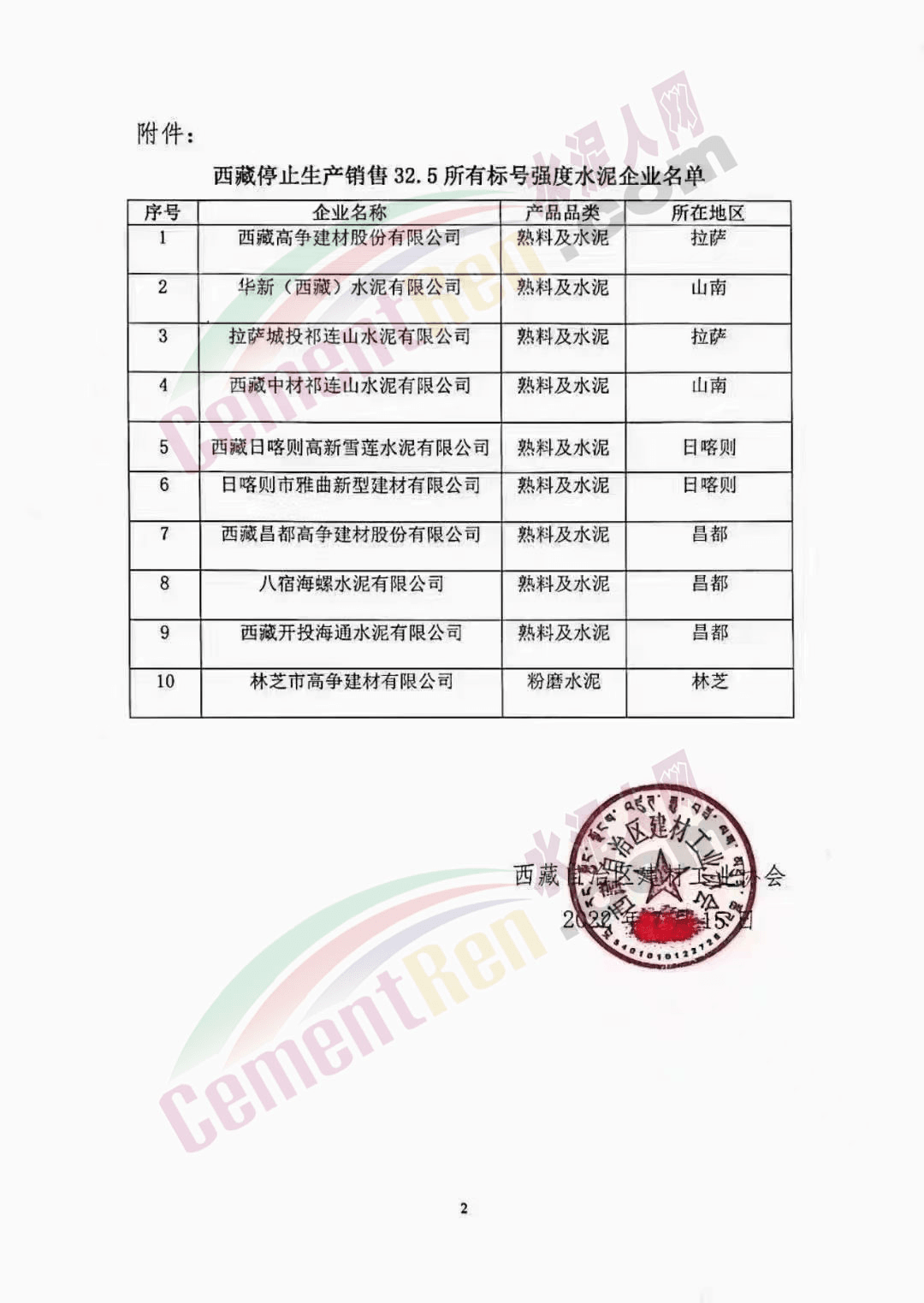 西藏停止生產(chǎn)銷售32.5所有標(biāo)號(hào)強(qiáng)度水泥企業(yè)名單中列出9家熟料及水泥企業(yè)名單,涉及區(qū)域包括拉薩、山南、日喀則、昌都以及林芝區(qū)域水泥粉磨站及全能水泥廠。