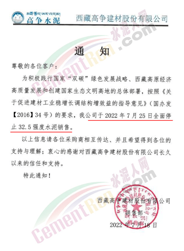 西藏高爭建材股份有限公司通知稱,自7月25日起全面停止32.5強(qiáng)度水泥銷售。