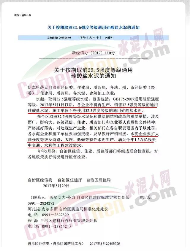 圖:新疆取消32.5強(qiáng)度等級(jí)水泥的通知