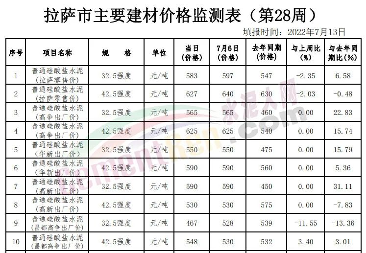 西藏自治區(qū)發(fā)改委近期發(fā)布的28種建材市場價(jià)格數(shù)據(jù)顯示,7月13日前后,5家主要品牌企業(yè)32.5強(qiáng)度水泥出廠均價(jià)551元/噸,42.5強(qiáng)度水泥出廠均價(jià)584元/噸,差價(jià)僅33元/噸。
