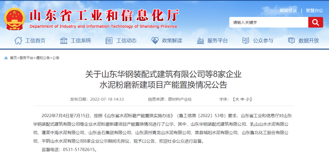 日前,山東省工信廳發(fā)布《關(guān)于山東華鋼裝配式建筑有限公司等8家企業(yè)水泥粉磨新建項(xiàng)目產(chǎn)能置換情況公告》稱,2022年7月4日至7月15日,按照《山東省水泥粉磨產(chǎn)能置換實(shí)施辦法》(魯工信原〔2022〕53號(hào))要求,山東省工業(yè)和信息廳對(duì)山東華鋼裝配式建筑有限公司等企業(yè)水泥粉磨新建項(xiàng)目產(chǎn)能置換情況進(jìn)行了公示,其中,山東華鋼裝配式建筑有限公司、乳山山水水泥有限公司、蓬萊中海水泥有限公司、山東金石集團(tuán)有限公司、山東濱州青龍山水泥有限公司、莒縣城陽水泥有限公司、山東魯北化工股份有限公司、平陰山水水泥有限公司8家企業(yè)公示期間無異議。