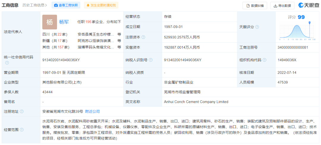 天眼查數(shù)據(jù)顯示:7月14日,安徽海螺水泥股份有限公司(以下簡(jiǎn)稱“海螺水泥”)法定代表人由王誠(chéng)變更為楊軍。