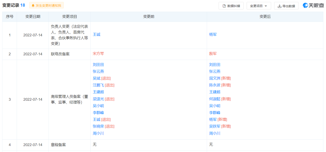 據(jù)查詢,7月14日發(fā)生的變更項(xiàng)目分別為負(fù)責(zé)人變更 ,聯(lián)絡(luò)員變更、高級(jí)管理人員備案變更等。