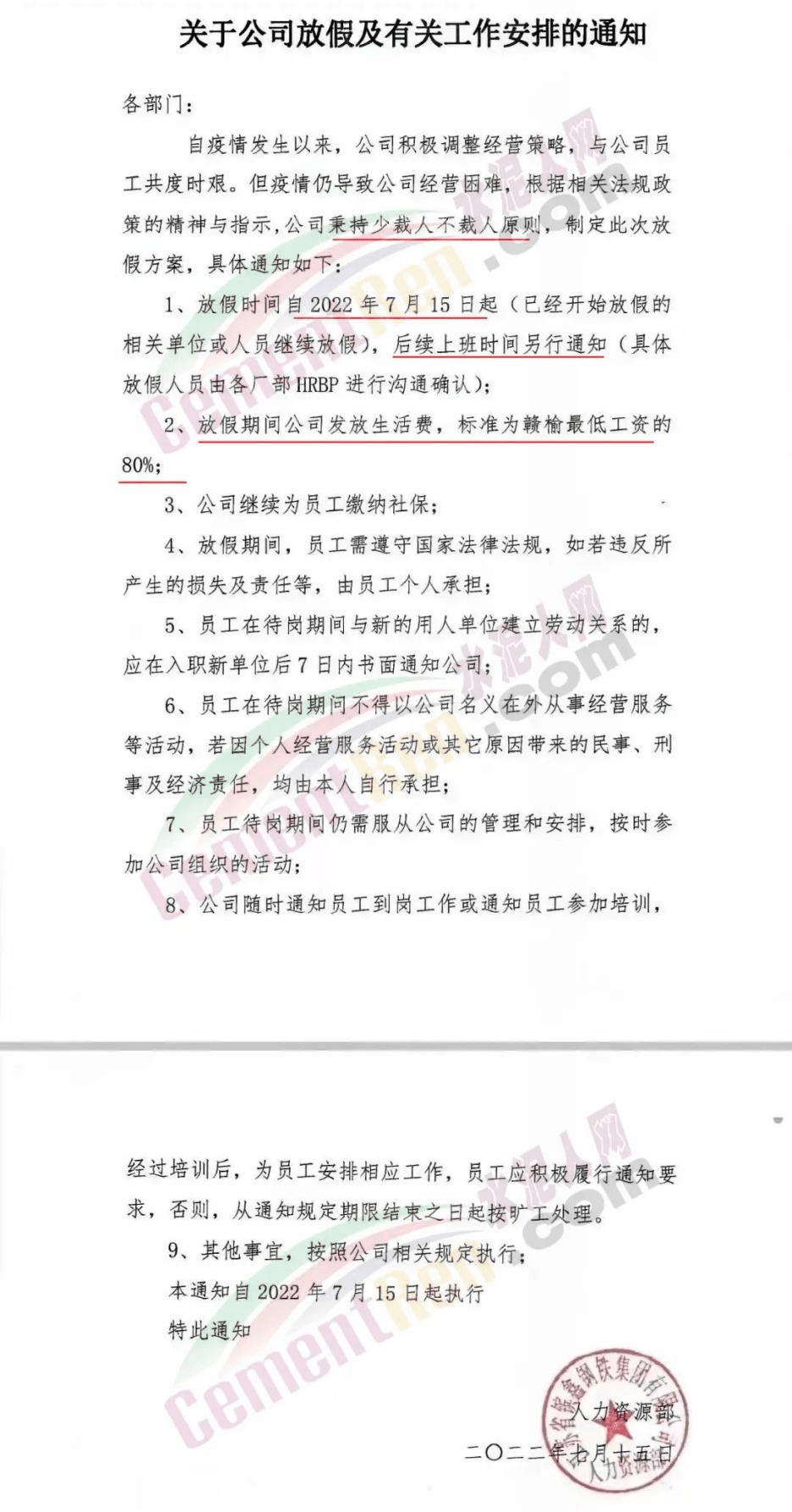 江蘇鑌鑫鋼鐵發(fā)放假通知稱,自2022年7月15日起放假,后續(xù)上班時間另行通知;放假期間公司發(fā)放生活費,標準為贛榆最低工資的80%……