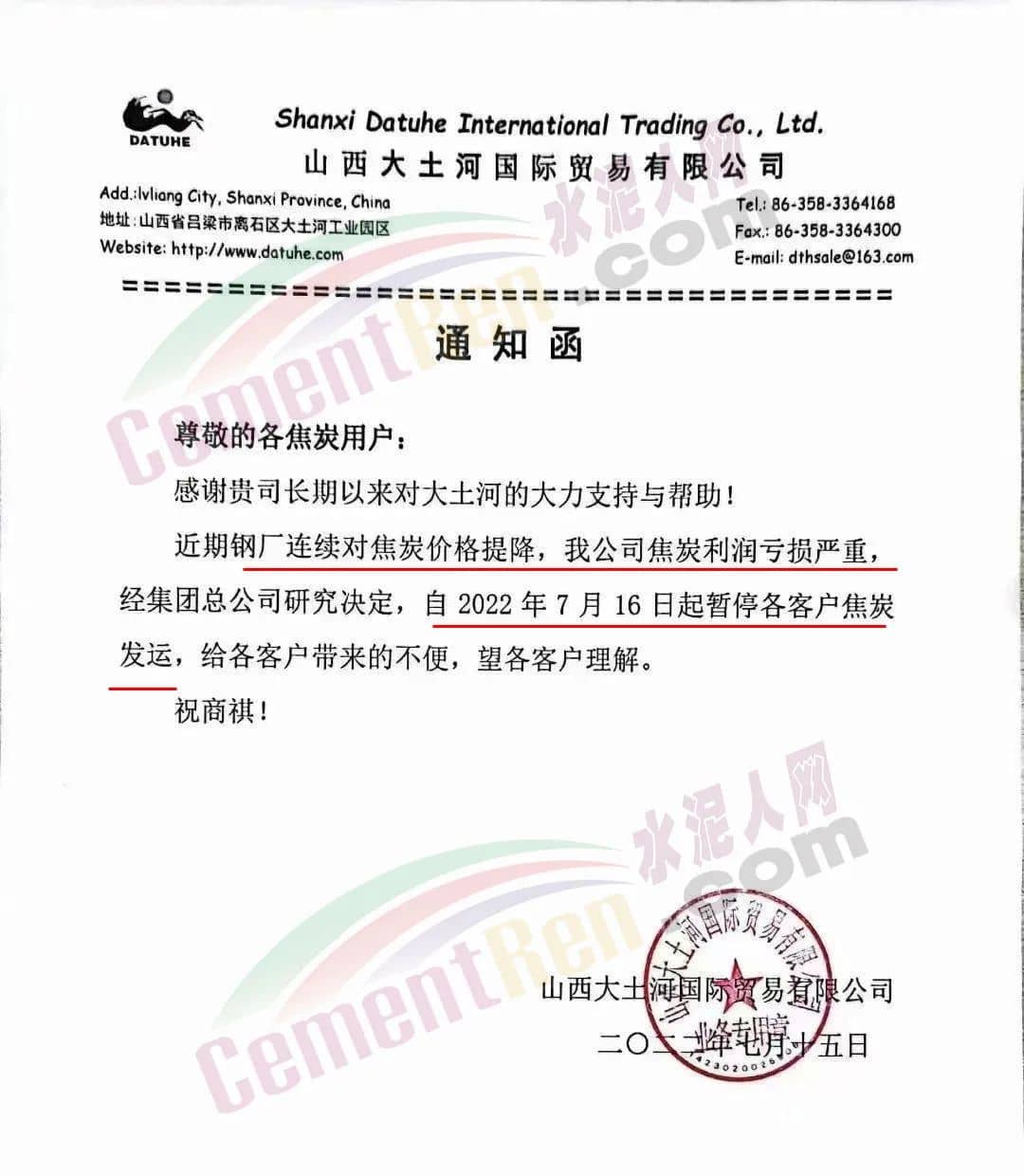 山西大土河國際貿易有限公司發(fā)通知函稱,近期鋼廠連續(xù)對焦炭價格提降,公司焦炭利潤虧損嚴重,經集團總公司研究決定,自7月16日起暫停各客戶焦炭發(fā)運。