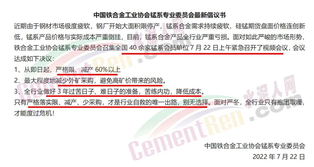 鐵合金工業(yè)協(xié)會錳系專業(yè)委員會召集全國40余家錳系會員單位7月22日上午緊急召開了視頻會議,會議達成決議:從即日起,嚴格限、減產60%以上;最大程度地減少外礦采購,避免高礦價帶來的風險;全行業(yè)做好3年過苦日子、難日子的準備,苦練內功,降低成本。
