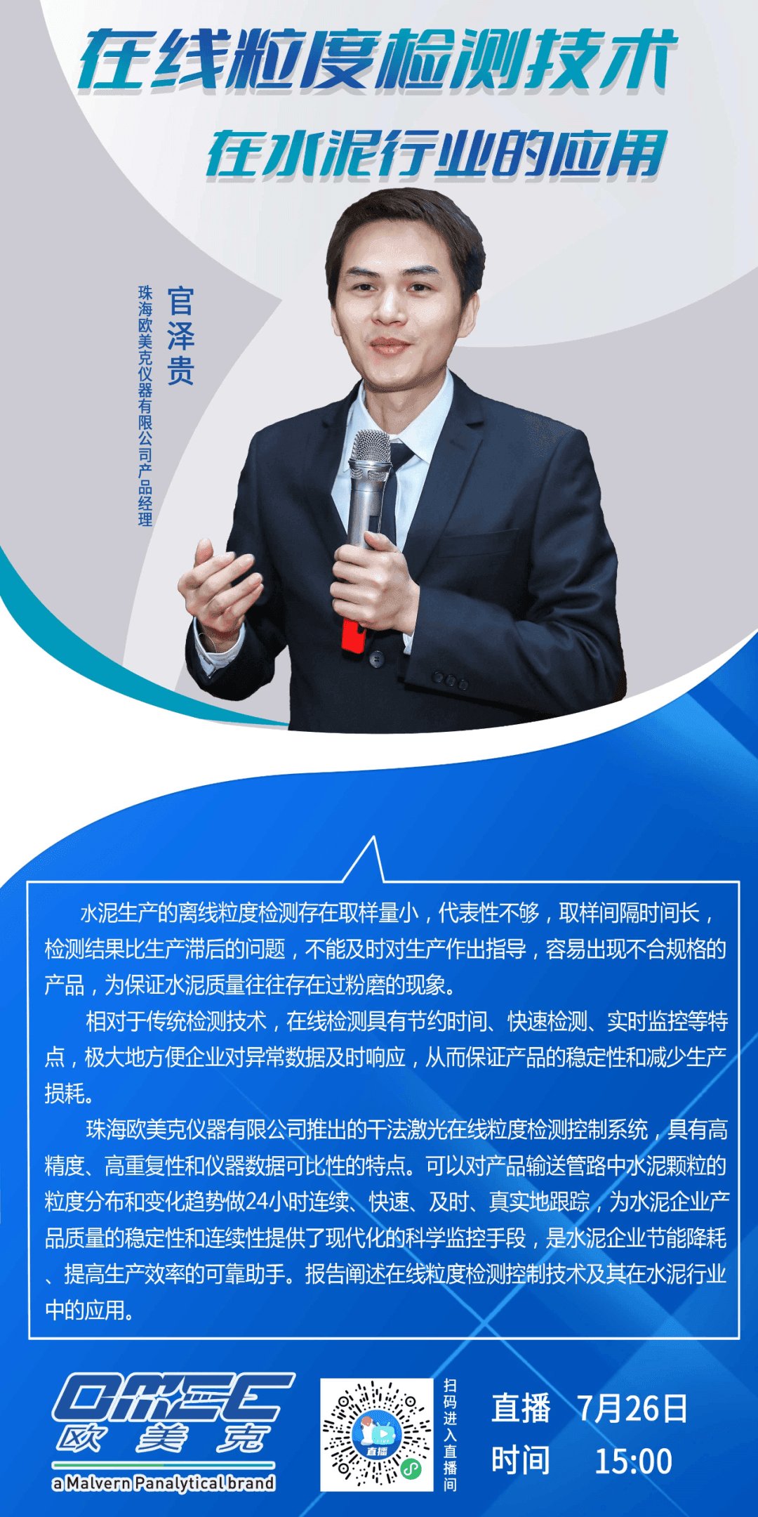 如何利用在線粒度檢測與控制系統(tǒng)幫助水泥、煤粉等多種工業(yè)在線檢測?請您在2022年7月26日15時前掃碼進入直播間,聽歐美克專業(yè)技術人員詳細講解……