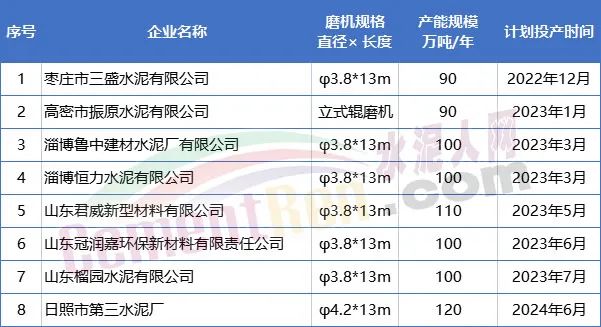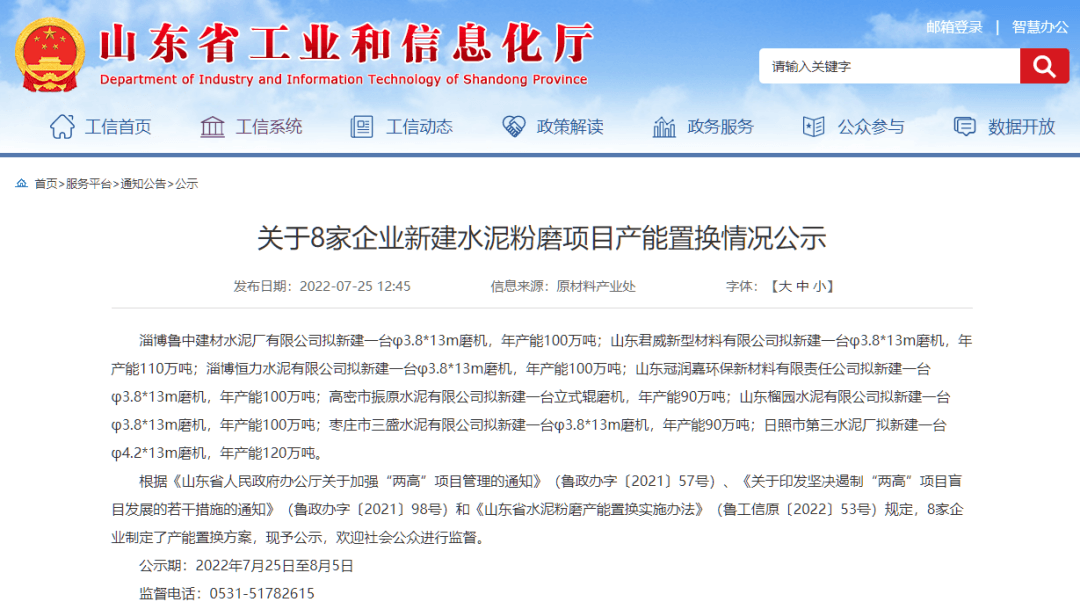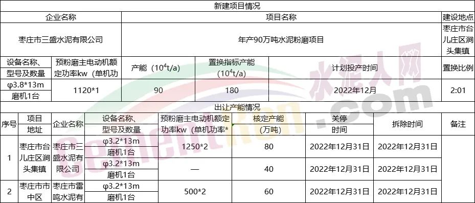 日前,山東省工信廳發布《關于8家企業新建水泥粉磨項目產能置換情況公示》稱,根據相關文件規定,8家企業制定了產能置換方案。置換比例全部為2:1,新建線產能規模為90~120萬噸/年,擬投產日期從2022年12月至2024年6月,合計產能達810萬噸/年,詳情如下: