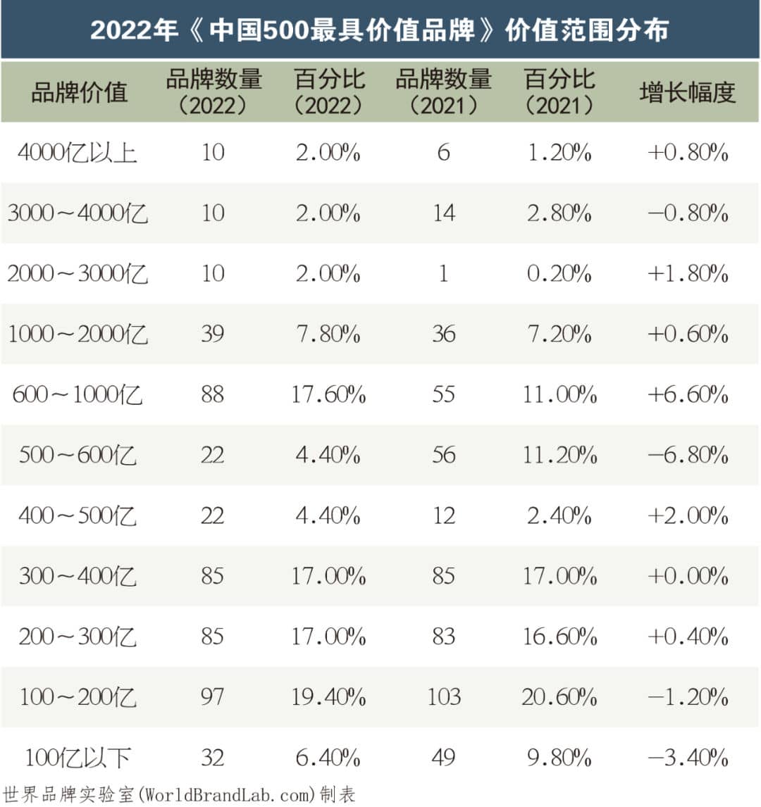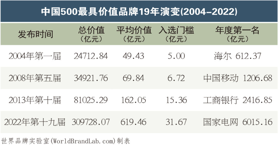 2022年《中國500最具價值品牌》的總價值為309728.07億元,比去年增加30774.87億元,增加幅度為11.03%。世界品牌實驗室學術委員會主席、牛津大學(Oxford)營銷學榮譽教授斯蒂芬·沃格(Steve Woolgar)表示:“品牌是一個國家的形象,我希望世界上更多的人能夠通過中國品牌了解中國的故事。在過去的17年中,我目睹了中國品牌的快速成長,有的已經具有強大的世界影響力”。世界品牌實驗室編制中國品牌報告已是第19個年頭,2004年入選門檻僅為5億元,前500名品牌的平均價值為49.43億元。19年以后的2022年,入選門檻已經提高到31.67億元,而前500名品牌的平均價值高達619.46億元,增加幅度為1153.21%。