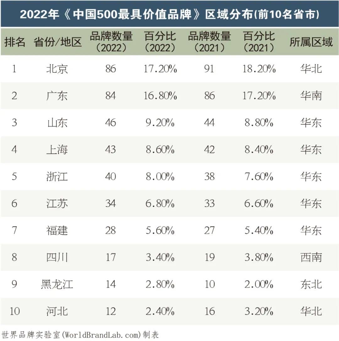 據世界品牌實驗室分析,一個區域的競爭實力,主要取決于其比較優勢,而品牌效益直接影響著地區比較優勢的形成和發展。品牌是一個地區發展的重要標志,品牌帶動區域經濟的增長,區域經濟的發展又促進當地品牌的成長。從本屆《中國500最具價值品牌》區域分布來看,北京有86個品牌入選,名列第一,主要原因是贏利能力強的央企總部集中在北京;廣東和山東分別有84個和46個品牌入選,位居第二和第三。根據入選品牌影響力范圍大小,可按照全國性、世界性品牌進行劃分。榜單中具有全國范圍影響力的品牌有438個,占87.60%;具有世界性影響力的品牌數為62個,占12.40%,比去年略有增加。