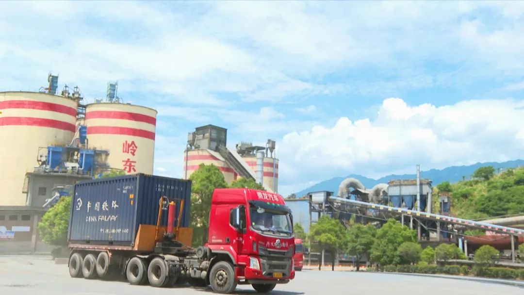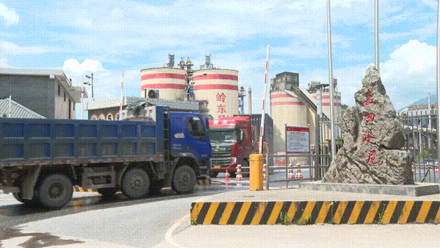 在廠區門口,多輛水泥運輸車來回穿梭,工人們搬運作業有序,現場一派緊張忙碌的景象。