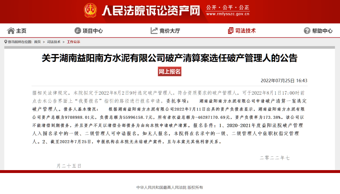日前,人民法院訴訟資產網發布《關于湖南益陽南方水泥有限公司破產清算案選任破產管理人的公告》稱,據相關法律規定,法院擬定于2022年8月2日9時選定破產管理人。符合資質要求的破產管理人,可于2022年8月1日17:00時前點擊本公告界面上“我要報名”指引的路徑進行報名申請。