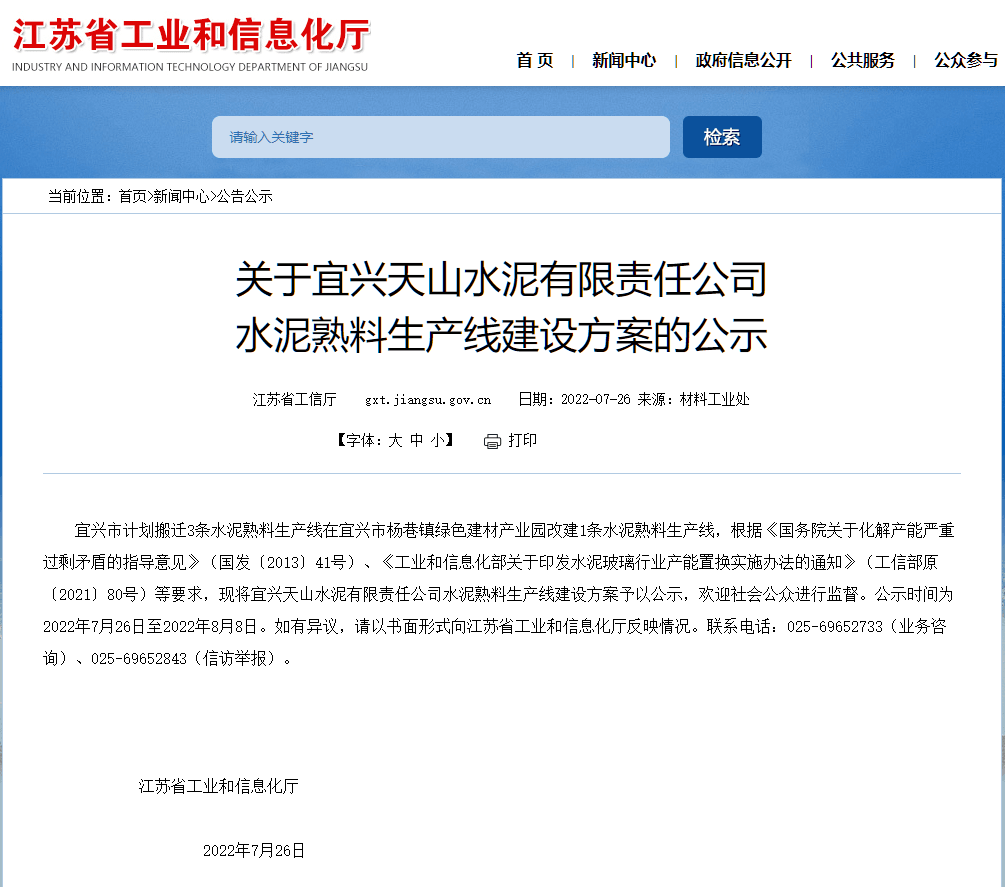 7月26日,江蘇省工信廳發布《關于宜興天山水泥有限責任公司水泥熟料生產線建設方案的公示》。公示內容顯示,宜興天山水泥有限責任公司通過退出宜興天山水泥有限責任公司、江蘇新街南方水泥有限公司、宜興市金墅水泥有限公司各一條熟料生產線產能,在宜興市楊巷鎮綠色建材產業園新建1條水泥熟料生產線,生產線窯規格為5.5×82米,產能225萬噸/年,建設時間為2024年。