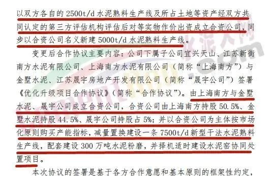 合作協議主要內容:公司下屬子公司宜興天山、江蘇新街南方水泥有限公司、上海南方水泥有限公司與金墅水泥、江蘇晟宇房地產開發有限公司簽署《優化升級項目合作協議》。由上海南方與金墅水泥、晟宇公司成立合資公司,合資公司由上海南方持股 50.5%、金墅水泥持股 44.5%、晟宇公司持股占 5%;并以合資公司為主體按市場化原則購買產能指標,減量置換建設一條 7500t/d 新型干法水泥熟料生產線,配套建設 300 萬噸水泥粉磨,并擇機適時建設水泥窯協同處置項目。