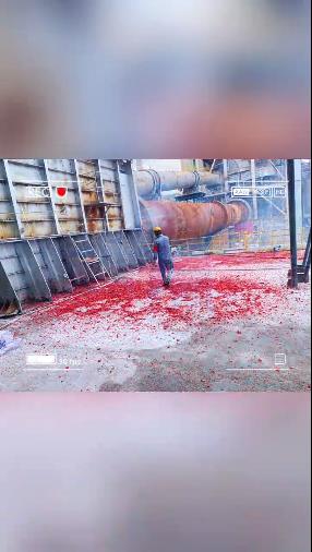廣東某水泥企業點火開窯:視頻中不僅放了鞭炮,還有兩名員工在殺公雞。據說這雞不能是母雞,母雞喻意“下蛋”,而水泥窯“下蛋”成了糟糕的喻意。
