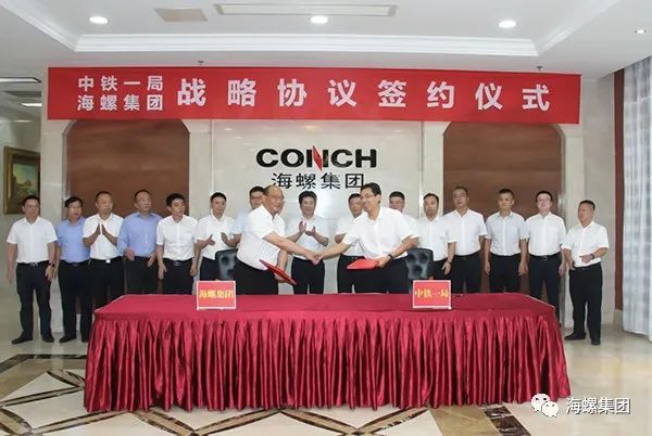 中鐵一局集團黨委書記、董事長馬海民,海螺集團黨委書記、董事長楊軍出席并見證簽約。海螺集團黨委書記、董事長楊軍表示,希望雙方在以往合作基礎上,以點帶面,不斷拓寬合作領域,將戰略合作協議落到實處,實現雙贏。中鐵一局集團黨委書記、董事長馬海民表示,希望雙方深化合作,信息共享、資源共享,發揮各自優勢,開展全方位合作,實現共贏。