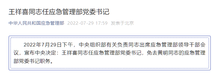 同日 ,應(yīng)急管理部官微消息:2022年7月29日下午, 中央組織部有關(guān)負(fù)責(zé)同志出席應(yīng)急管理部領(lǐng)導(dǎo)干部會(huì)議, 宣布中央決定:王祥喜同志任應(yīng)急管理部黨委書記,免去黃明同志的應(yīng)急管理部黨委書記職務(wù)。