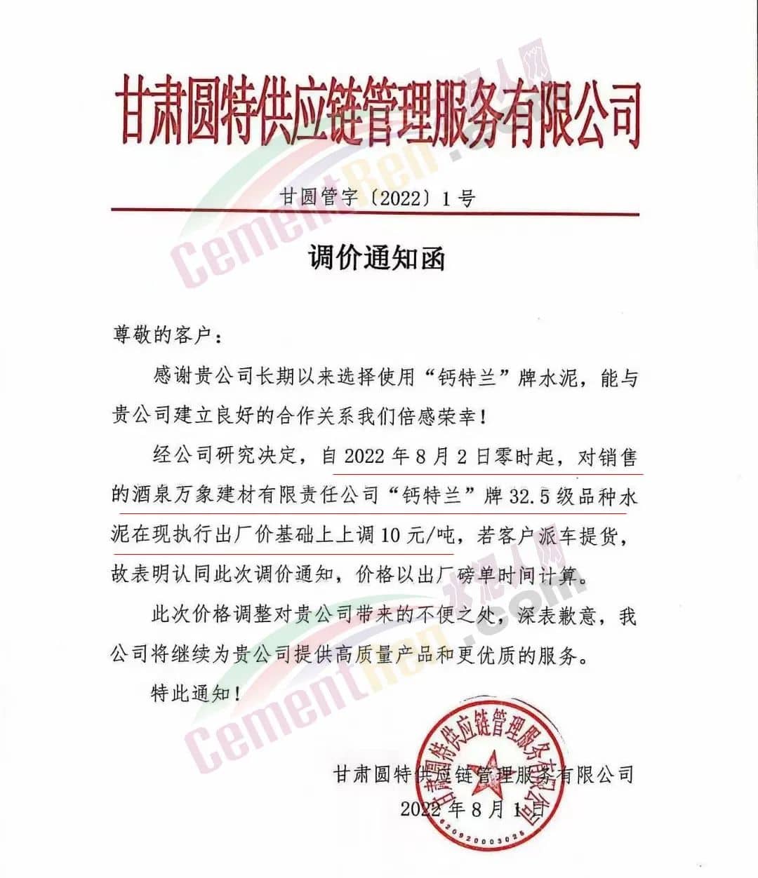 水泥人網通訊員消息:日前,甘肅圓特供應鏈管理服務有限公司通知,自8月2日零時起,對銷售的酒泉萬象建材有限公司“鈣特蘭”牌32.5級品種水泥在現執行出廠價基礎上上調10元/噸。