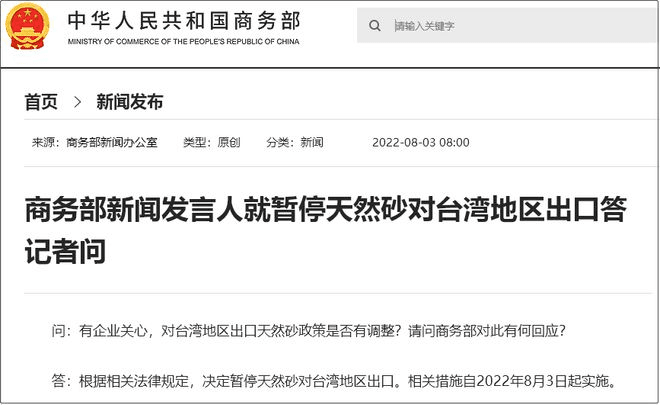 自佩洛西竄訪后,中國進行了雷霆反制。據(jù)商務部網(wǎng)站消息,商務部新聞發(fā)言人就暫停天然砂對臺灣地區(qū)出口答記者問。商務部新聞發(fā)言人表示,根據(jù)相關法律規(guī)定,決定暫停天然砂對臺灣地區(qū)出口,相關措施自2022年8月3日起實施。