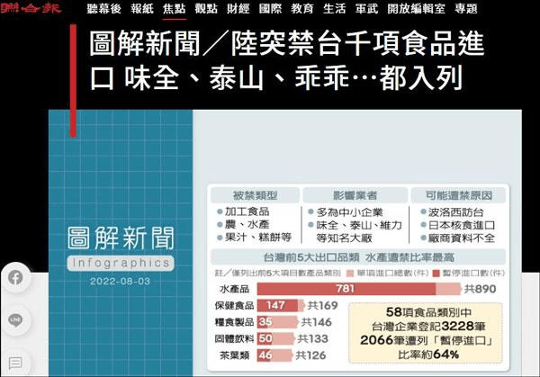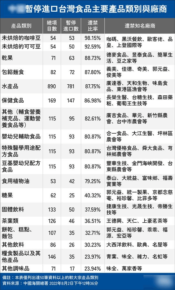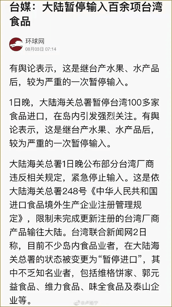 消息顯示,8月1日晚,海關總署就宣布暫停對中國臺灣地區(qū)的100多家食品進口,隨后清單又進一步擴大,自8月3日起暫停進口中國臺灣地區(qū)的檸檬、葡萄柚等柑橘類水果以及冰鮮白帶魚、凍竹莢魚等水產(chǎn)品。