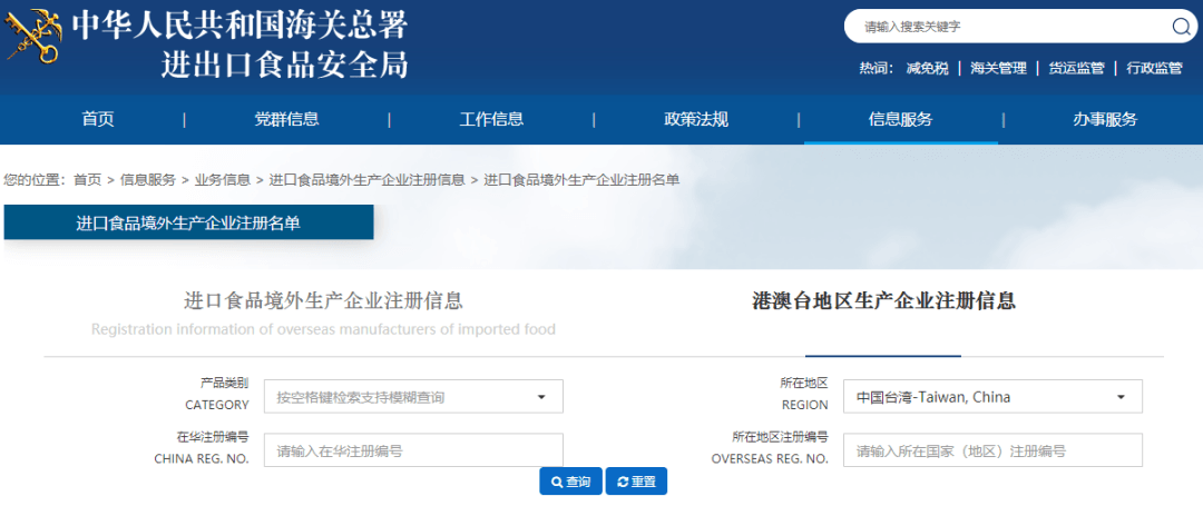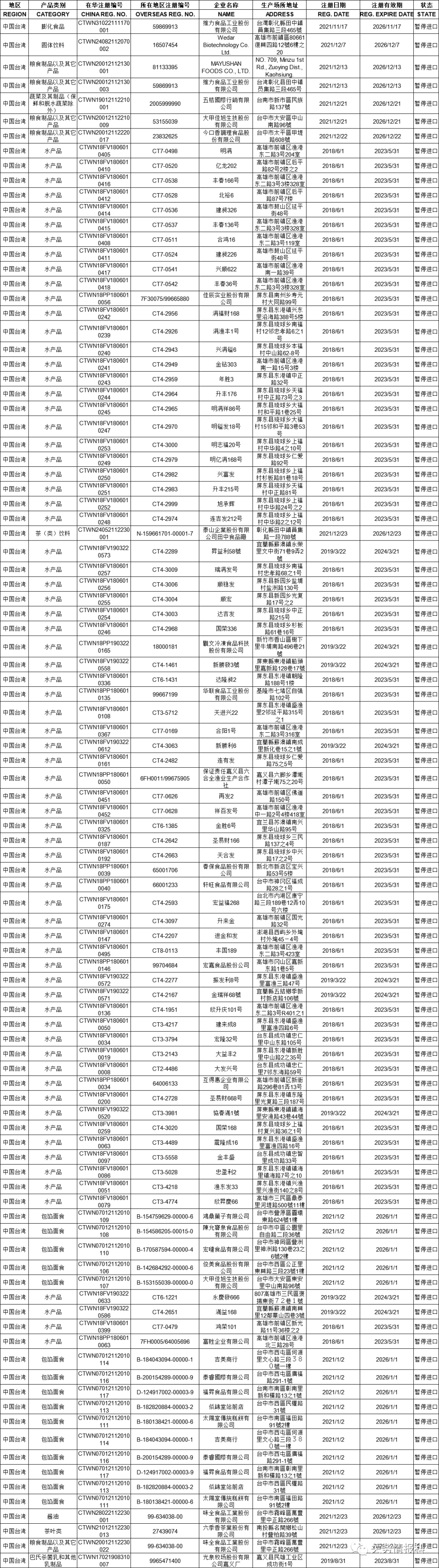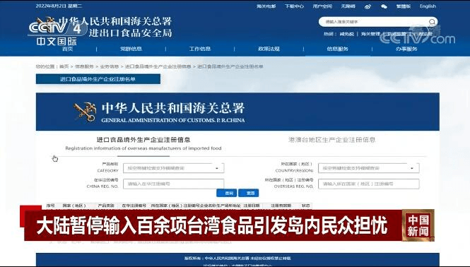 在海關總署官網(wǎng)港澳臺地區(qū)生產(chǎn)企業(yè)注冊信息頁面上查詢臺灣生產(chǎn)商資料,有部分企業(yè)的狀態(tài)欄已顯示“暫停進口”,其中包括維力食品、郭元益食品、味全食品、泰山、維格餅家等。據(jù)悉,這是依據(jù)海關總署第248號令《中華人民共和國進口食品境外生產(chǎn)企業(yè)注冊管理規(guī)定》,限制未完成更新注冊的臺灣廠商產(chǎn)品輸往大陸。