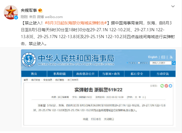 據(jù)中國海事局官網(wǎng),東海,自8月3日至8月5日每天6時30分至18時30分在29-27.1N 122-10.23E、29-27.13N 122-13.83E、29-25.17N 122-13.83E及29-25.15N 122-10.23E四點連線間海域進行實彈射擊,禁止駛入。