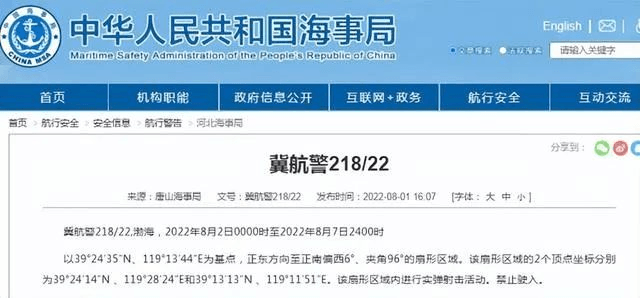 據(jù)唐山海事局發(fā)布的消息:冀航警218/22,渤海,2022年8月2日0000時至2022年8月7日2400時,以39°24′35″N、119°13′44″E為基點,正東方向至正南偏西6°、夾角96°的扇形區(qū)域。該扇形區(qū)域的2個頂點坐標分別為39°24′14″N、119°28′24″E和39°13′13″N、119°11′51″E。該扇形區(qū)域內(nèi)進行實彈射擊活動,禁止駛入。