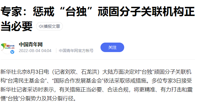 也就是說,無論是經(jīng)濟還是軍事,多個領域的反制都會帶來嚴重的影響,且力度大小取決于后續(xù)的事態(tài)發(fā)展。國臺辦發(fā)言人馬曉光也表態(tài),我們采取必要措施反制是維護主權和領土完整的應有之義、正當之舉。我們敦促有關組織和個人,停止混淆是非、顛倒黑白,停止為“臺獨”勢力和任何干涉他國內(nèi)政的人辯解,用實際行動恪守在臺灣問題上作出的嚴肅承諾,恪守一個中國原則,停止任何干涉中國內(nèi)政和挑釁中國主權和領土完整的行徑。
