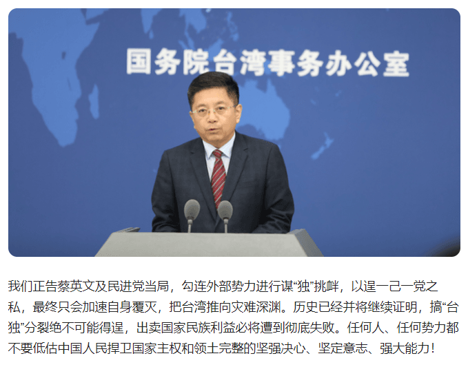 國臺辦表示,歷史已經(jīng)并將繼續(xù)證明,搞“臺獨”分裂絕不可能得逞,出賣國家民族利益必將遭到徹底失敗。任何人、任何勢力都不要低估中國人民捍衛(wèi)國家主權和領土完整的堅強決心、堅定意志、強大能力!