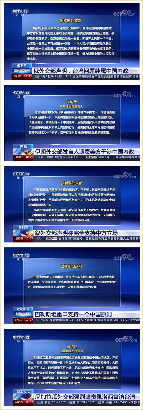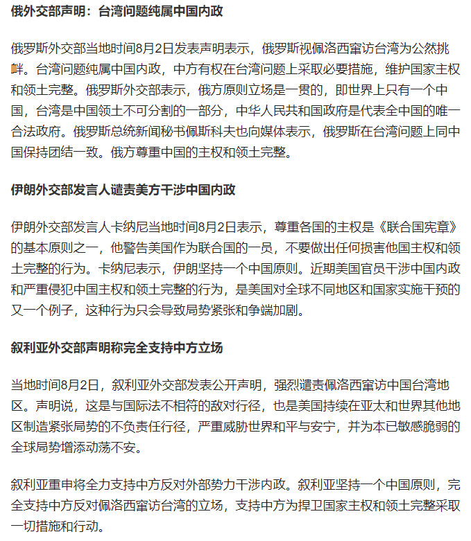 對于美國國會眾議長佩洛西不顧中方強烈反對和嚴正交涉,竄訪中國臺灣地區(qū)的行為,俄羅斯、伊朗、敘利亞、巴基斯坦等多國政府發(fā)表聲明表示強烈譴責,并重申支持一個中國原則。